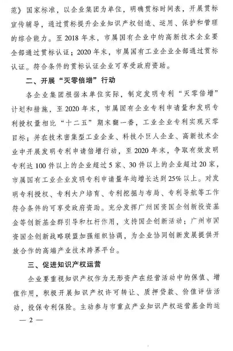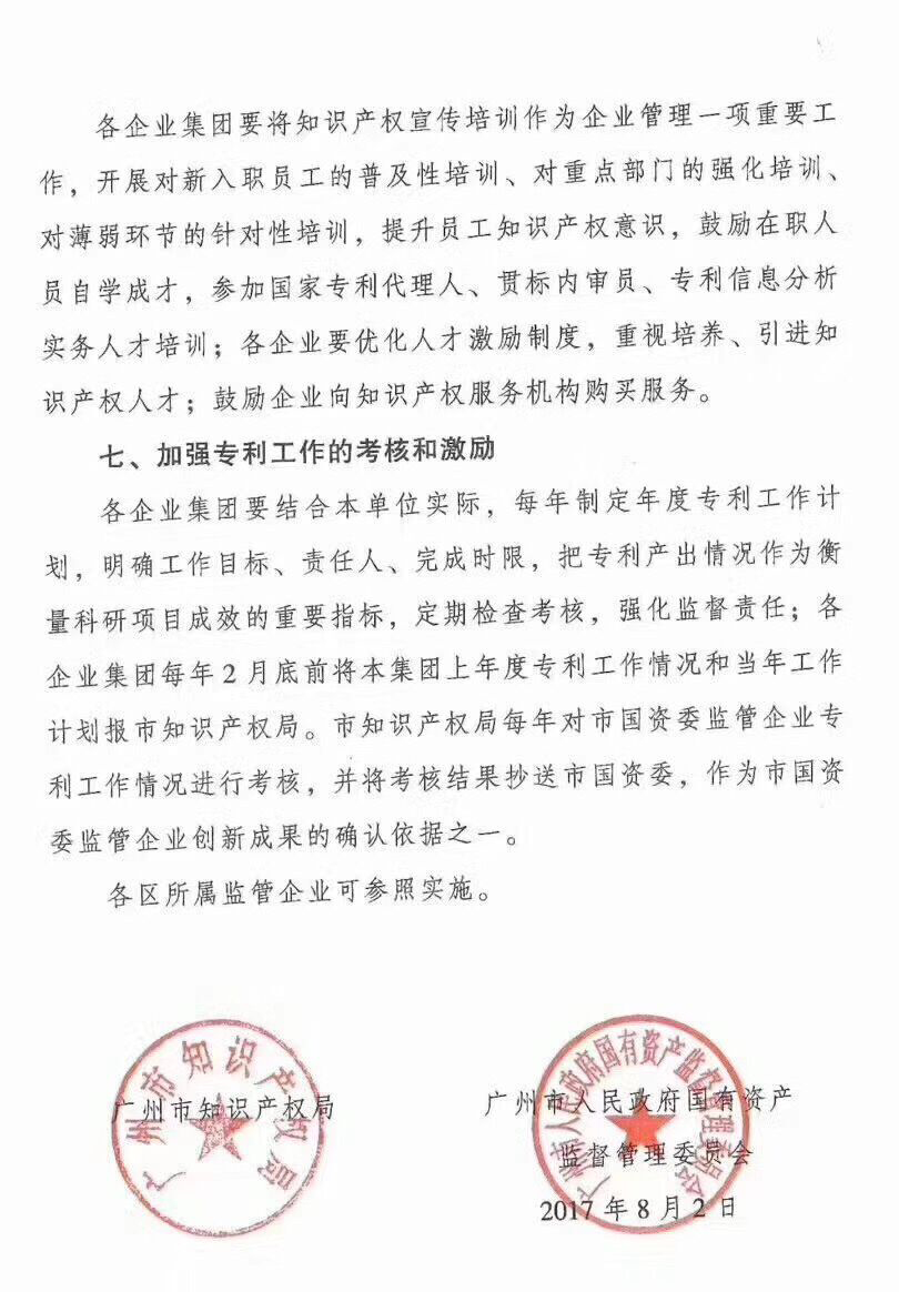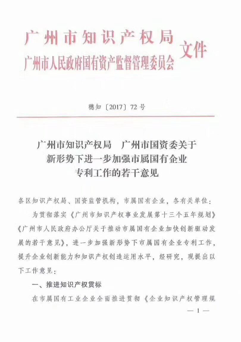 廣州市知識產(chǎn)權局 廣州市國資委關(guān)于新形式下進(jìn)一步加強市屬?lài)衅髽I(yè)專(zhuān)利工作的若干意見(jiàn):